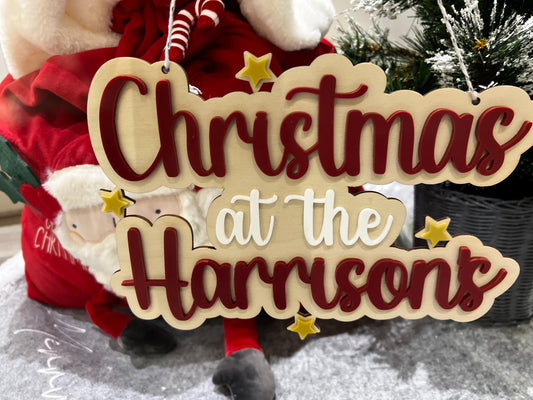 Personalised Wooden Christmas at the Surname Sign - Natural Plywood & Colour Acrylic - Wreath name sign