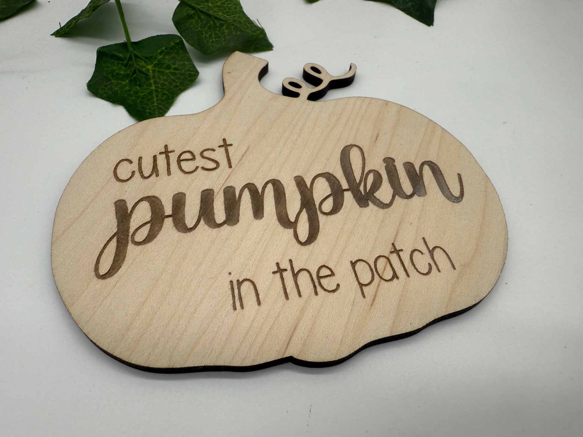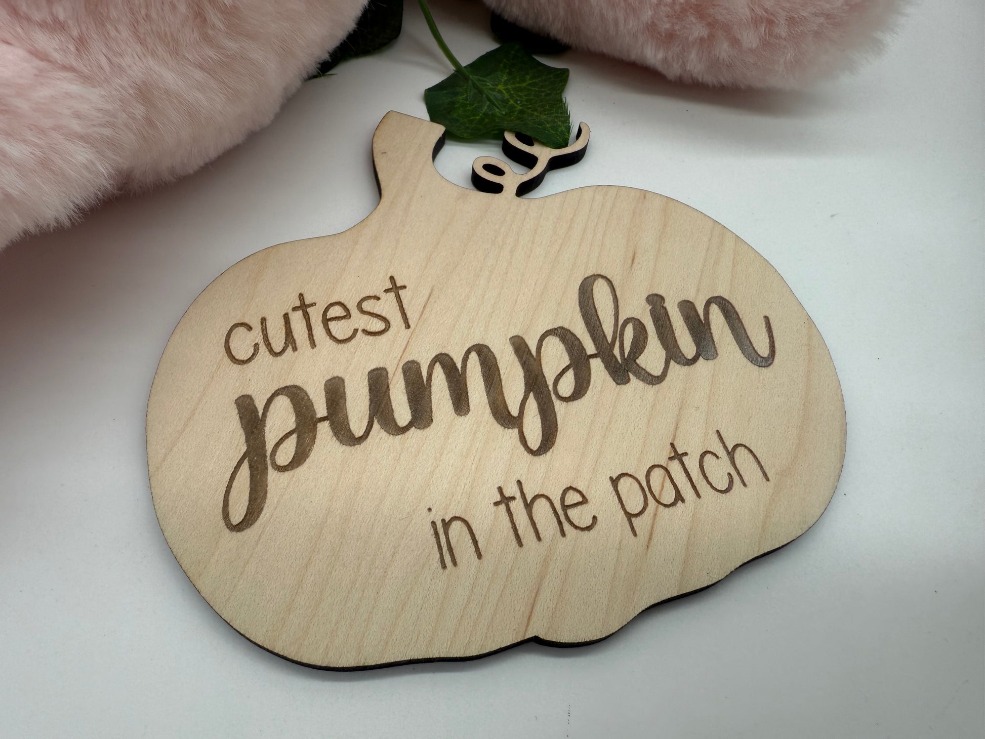 Maple veneer pumpkin sign engraved with 'boo basket' and personalised with a matt acrylic name.