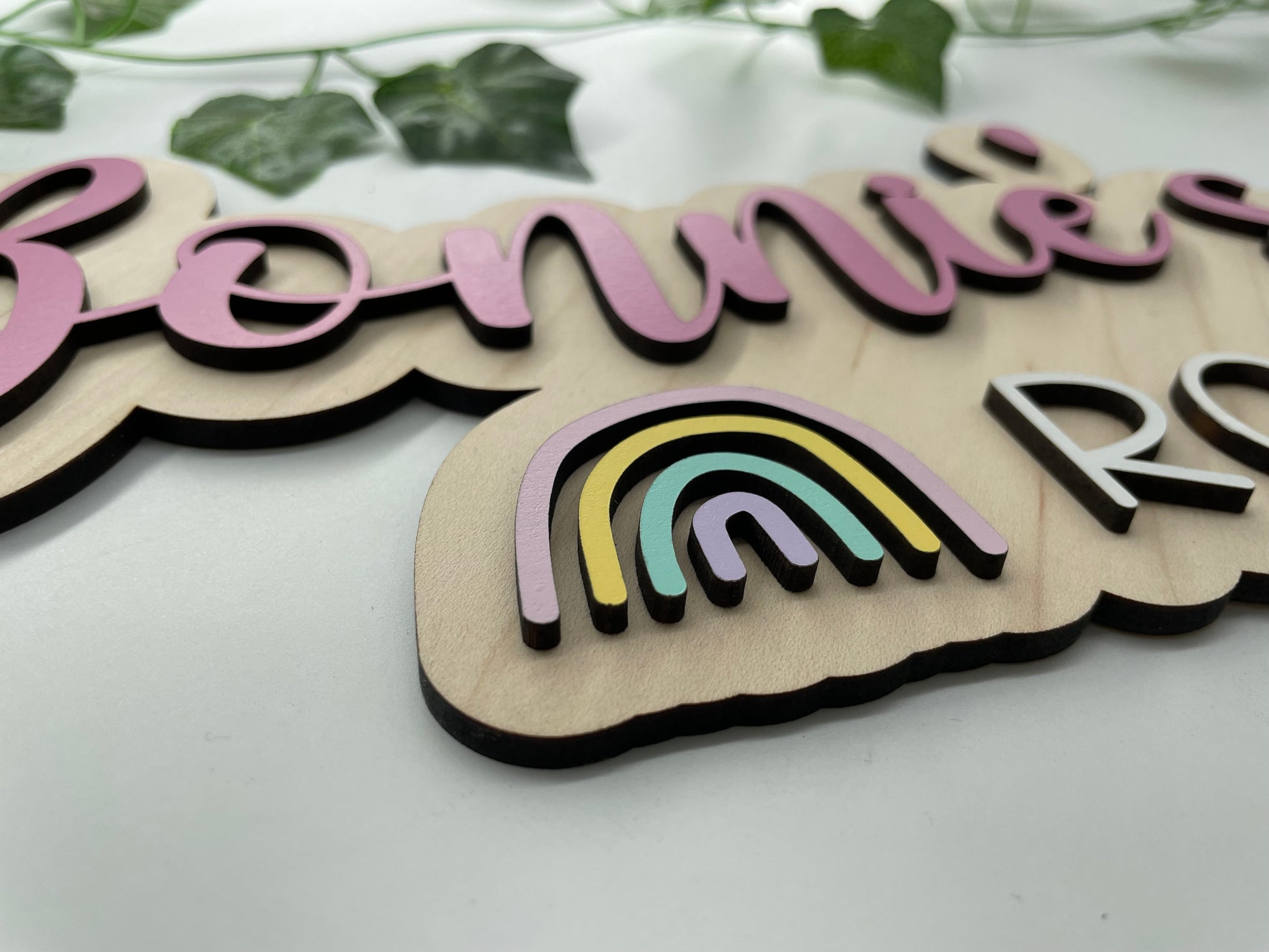 Beautiful room door signs made from 4mm maple veneer (natural grain) wood with a 3mm painted MDF name and rainbow overlay.