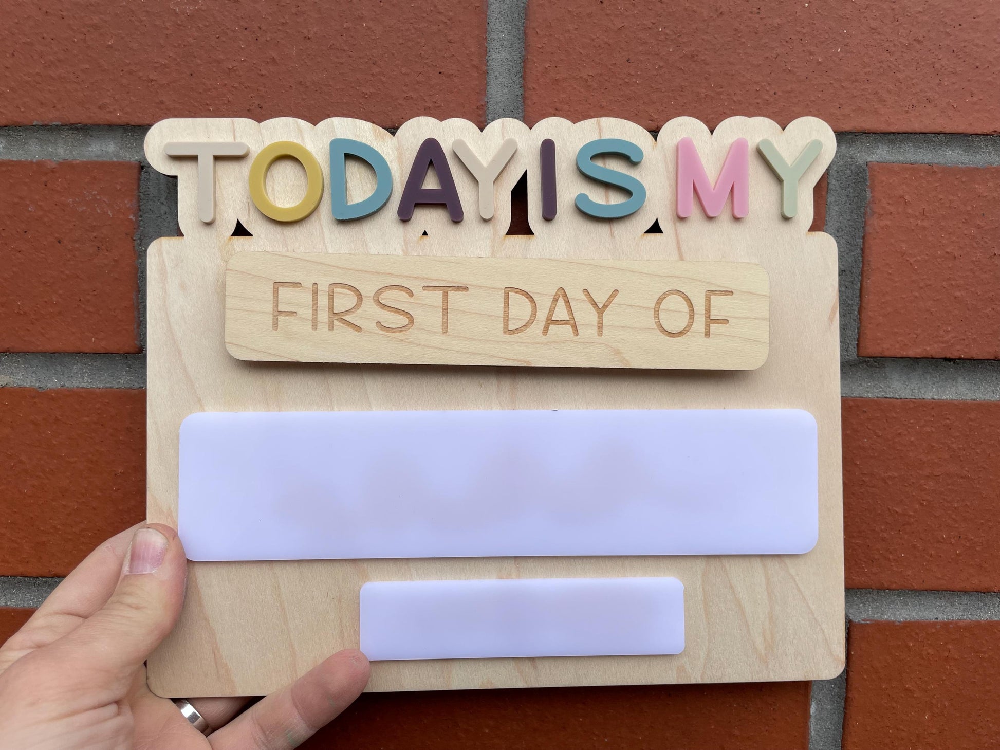 Personalised first day of school/nursery reusable sign with dry-erase panels.