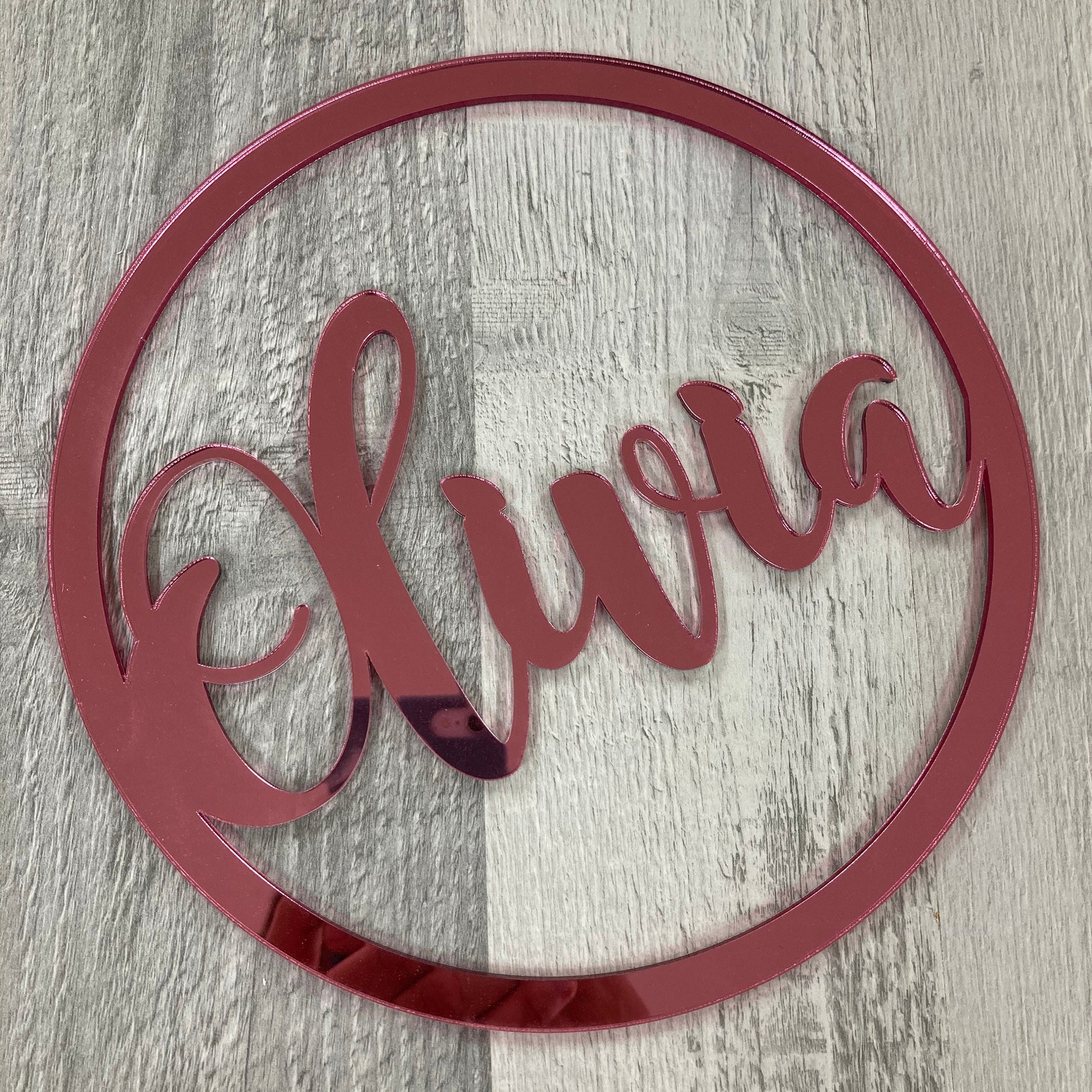 A beautiful mirror finished acrylic hoop personalised with any name or word (up to two words can be fit on one hoop).