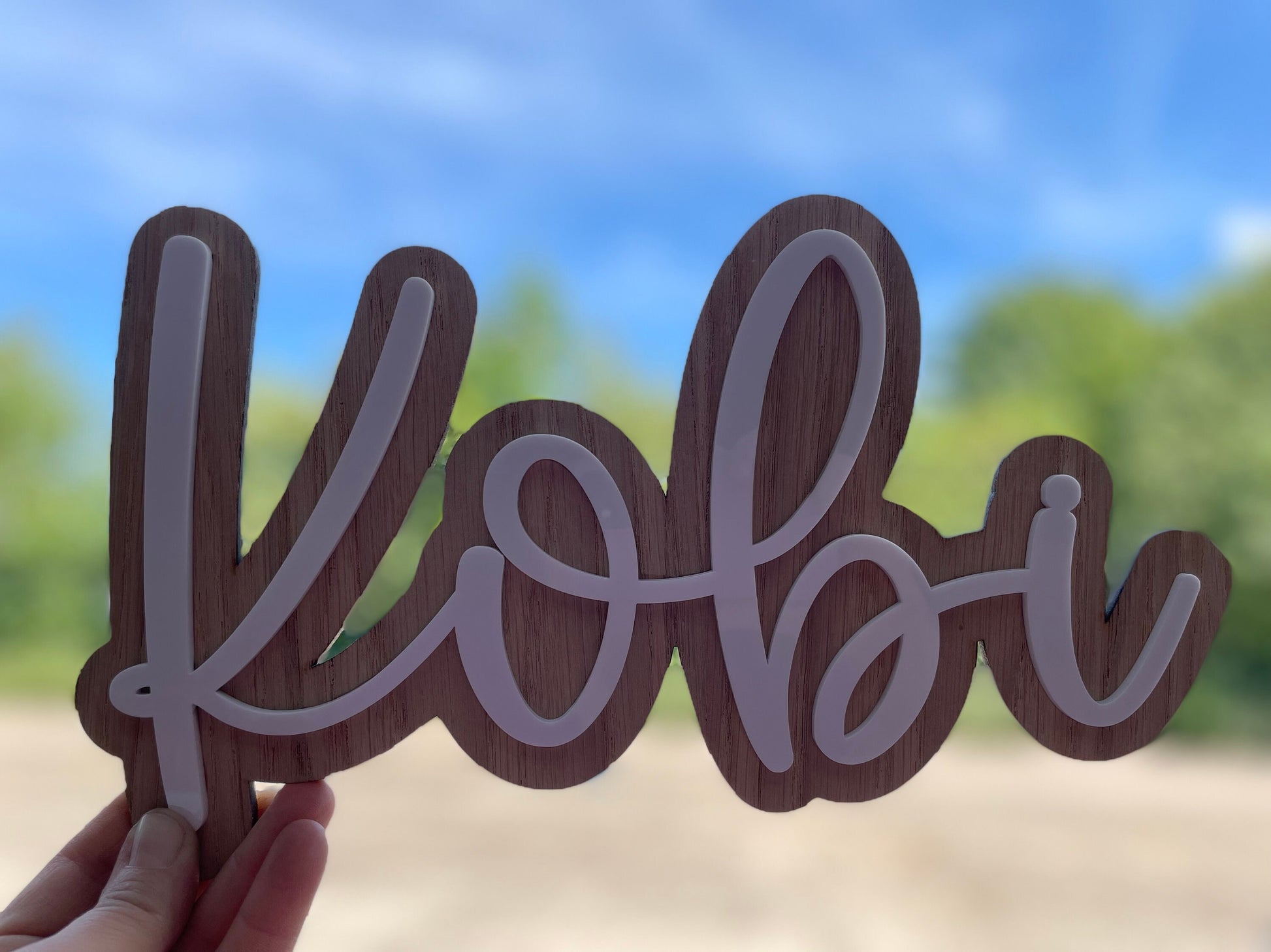 The backing is made from oak veneer and the front is made from acrylic The backing thickness is 4mm and the top layer is 3mm so the total depth of the sign will be 7mm.