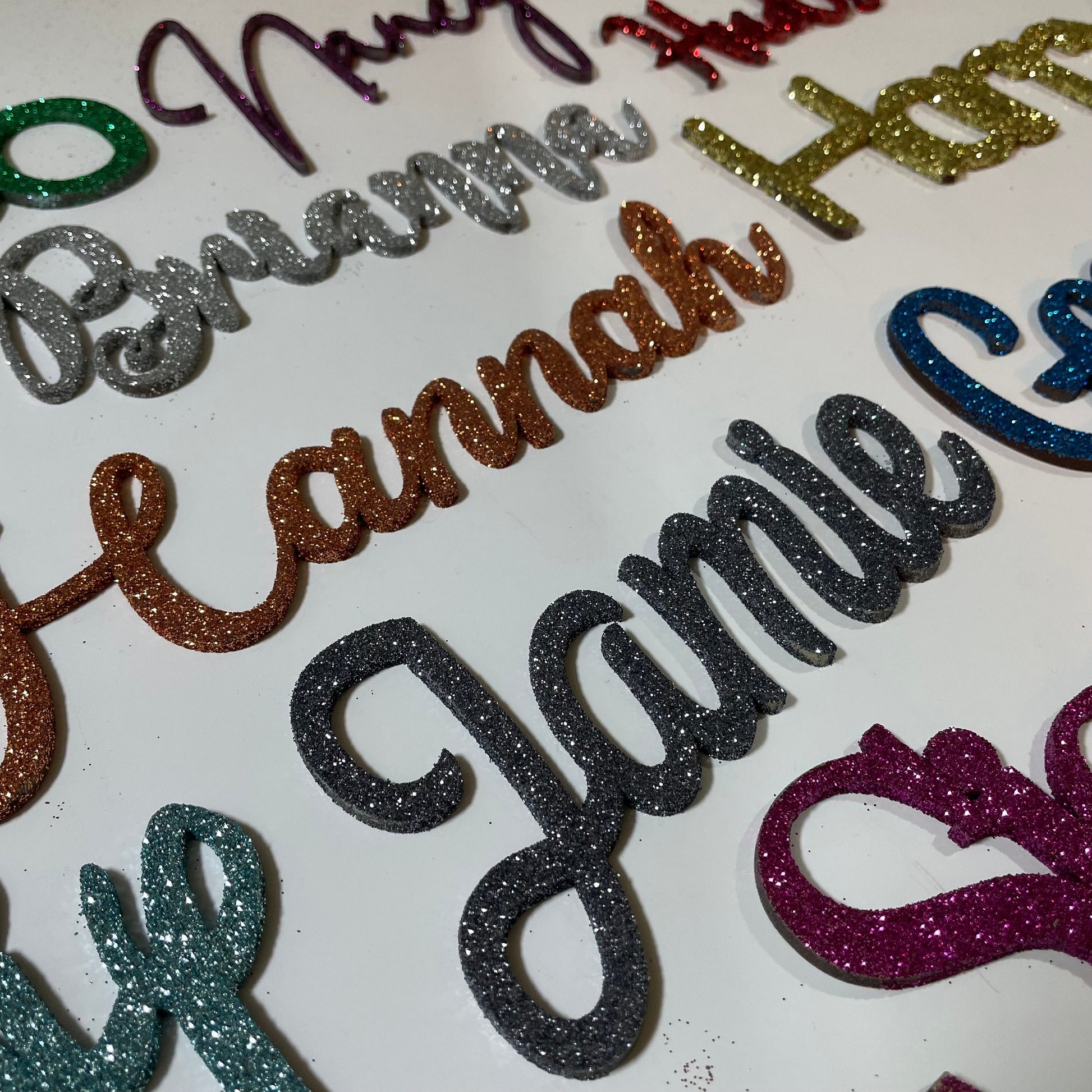 Personalised wooden name signs finished with real glitter and sealed to avoid excess glitter loss.