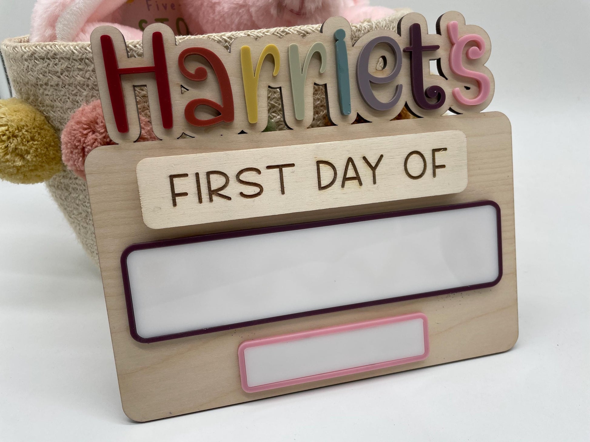 Personalised first day of school/nursery reusable sign with dry-erase panels.